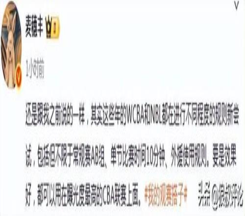 媒体人麦穗丰发文点评:其实这些年的WCBA和NBL都在进行不同程度的规则新尝试,包括但不限于常规赛AB组、单节比赛时间10分钟、外援使用规则。要是效果好,都可以用在曝光度最高的CBA联赛上面。