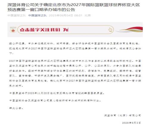 新京报讯 据中国篮球之队官微消息,经公开征集、申办单位提交材料、城市考察、综合评估并报中国篮球协会及国家体育总局批准,现选定北京市为2027年国际篮联篮球世界杯亚大区预选赛第一窗口期承办城市。相关情况公告如下: