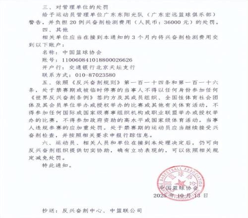 按照篮协公布的消息,在调查过程中,吉伦沃特对检查结果进行了说明,并提供了相关证据材料,能够证明其是在赛外摄入、使用禁用物质,与提升运动能力无关。接到兴奋剂违规通知后,吉伦沃特在规定时间内签署了结果管理回执单,承认兴奋剂违规,接受通知中指控的结果。为此篮协对吉伦沃特做出了禁赛三个月的处罚;队医林志达作为广东男篮医疗与反兴奋剂负责人,给予警告处分;广东男篮监管方面不到位,被处于警告处分,并承担20例兴奋剂检测费用36000元。在这则通告的最后,篮协还有另外一句话,那就是“运动员、相关人员和单位如果能够向反兴奋剂组织提供切实协助,确有立功表现的,可以依照规定减免处罚。”
