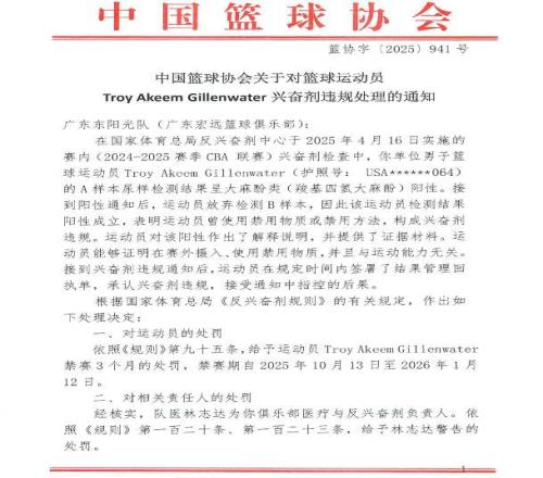 中国篮协官宣!吉伦沃特服用兴奋剂调查结果出炉,广东男篮被处罚