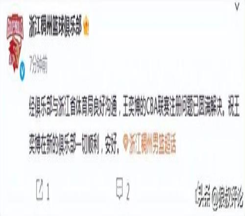 北京时间8月28日,根据浙江男篮官方社交媒体公示,经俱乐部与浙江省体育局良好沟通,王奕博的CBA联赛注册问题已圆满解决。祝王奕博在新的俱乐部一切顺利,安好。