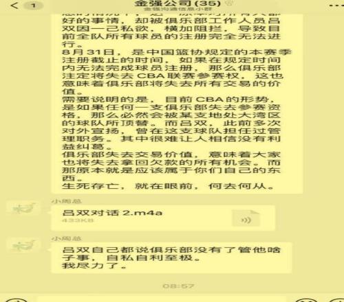 周冰晗质疑吕双动机不纯,他说吕双曾多次公开宣扬自己曾在大湾区某支球队担任过管理职务,所以合理怀疑吕双和那支球队有利益纠葛。因此,周冰晗大胆预测,假如四川男篮真的因为无法注册球员而退出CBA联赛,那么取而代之的应该就是吕双曾经担任过管理职务的那支大湾区球队。