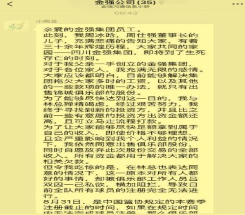 据四川男篮俱乐部少主——周仕强儿子周冰晗亲自爆料,他为了先把拖欠球员半年工资的问题解决了,打算通过变卖股权的方式断臂求生,但是却受到俱乐部总经理吕双的阻挠。