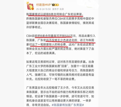 根据CBA记者付政浩透露,广东队为了得到锋线球员陈国豪,广东队开出了超级 B 类合同,还将王少杰送回北控队,完成 “新旧状元互换”,与此同时,广东队还给北控队一笔额度惊人的转会费。朱芳雨这般 “豪掷千金” 的操作,可以说是诚意十足。