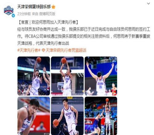 如今天津男篮官宣:“经与球员友好协商并达成一致,我俱乐部已于近日完成与自由球员何思雨的签约工作。待CBA公司审核通过我俱乐部提交的相关注册资料后,何思雨将于新赛季重披天津战袍,代表天津先行者出战。”