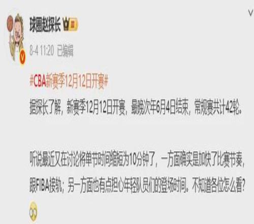 按照国内知名媒体人报道,CBA的25-26赛季将于今年12月12日才会开赛,最晚明年6月4日结束,常规赛总共42轮,可能将原本的单节12分钟缩减至10分钟。