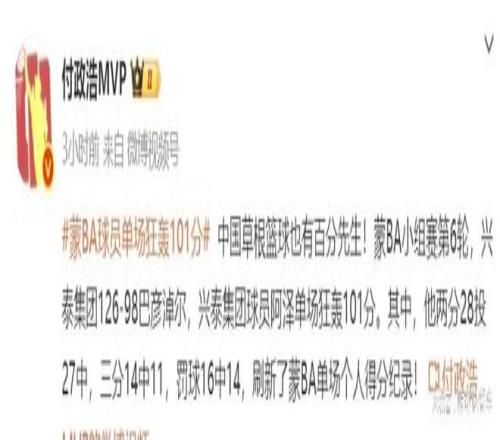 最近几年,随着篮球的崛起,不少省份、市区,甚至是乡镇都开始玩起“X”BA了。除了大火特火的村BA外,近日,蒙BA也正式打开了。目前,已经进行到第6轮了。原本,这也只是少数人关注的一项赛事。不过,正所谓也是低级的联赛,便越有可能创造纪录。在过去,这种级别的联赛,除了单场最大分差缔造者外,也是单场得分纪录的缔造者。尤其是随着职业球员参赛后,这数据更是被不断刷新。这不,作为CBA前球员,阿泽也参加了这一次蒙BA。在这一场比赛中,阿泽堪称是超级大杀器,突破、中投、三分,以及扣篮,他简直无所不能,作为一名职业球员,在蒙BA联赛中,他简直就像是乔丹般的存在。这一场比赛中,他疯狂出手42次,命中38球,命中率达到竟然90%。这其中两分球28投27中,只投丢了一球,而三分球也非常客观,14投11中,命中率达到78.5%。罚球16罚14中,疯狂砍下101分。2023年,阿泽曾参加过CBA选秀大会,并且在首轮第11顺位被山东队选中,成为了一名职业球员。在加盟CBA的第一个赛季,阿泽只代表山东队出战10场比赛,场均出战7分钟,场均能够得到1.1分1.4板,整体数据还算不错。作为一名新秀,阿泽这样的表现,其实还是符合预期的。只不过,遗憾的是,阿泽只代表山东队出战一个赛季,2024年下半年,阿泽便离开了山东队。严格意义上来看,阿泽目前还算处于新秀期。1999年出生的阿泽,今年只有25岁,单从年龄上来讲,他还是非常年轻的,尽管已经离开了CBA联赛,不过,作为一名实力不俗的球员,在其他联赛,他还是混得风生水起。尽管不打职业联赛,在野球场和“X”BA上,他也是大有可为。比如说这一次蒙BA,阿泽便成为了该联赛的大杀器。单从整体实力上来看,他已经与其他球员完成甩开一个档次。当然,作为职业球员,参加这种级别的联赛,拿到高分,这也是意料之中的事情。毕竟,单从实力上来讲,阿泽便强出其他人一个档次。另外,像这种职业球员参加野球局,大杀四方的事情早就有了。当年广东队小后卫史鸿飞,他也曾在业余联赛中,疯狂砍下157分的高分。作为CBA的神射手,他在野球场上,简直就是大杀器般的存在,三分球弹无虚发。