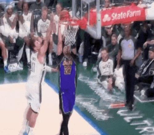 本想找点莱恩的高光镜头吹一波,看来看去发现要么空篮不进要么被大帽,倒是成了五大囧或五佳球背景板的常客,前队友詹姆斯都不放过他。