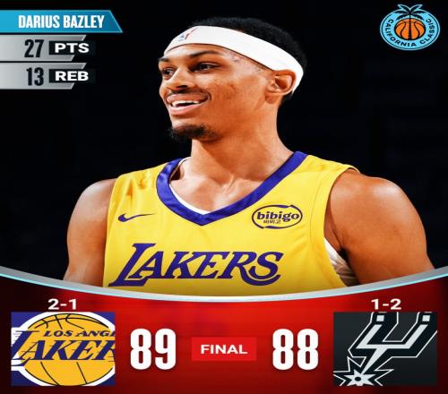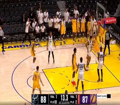 体育资讯07月09日报道宣称 NBA夏联加州经典赛,湖人89-88击败马刺,19年首轮秀、广东名宿贝兹利补扣绝杀。