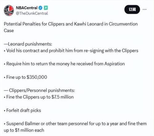从联盟的角度来看,更稳妥的做法或许是:将整个调查和处罚流程拖到明年春天,待常规赛结束后再作废莱昂纳德的合同,让他能在夏天通过正常流程寻找新球队。若无法做到这一点,联盟也可能选择“保留莱昂纳德的合同(仍计入快船队薪资帽)”,转而对快船队采取其他惩罚措施——比如将Aspiration支付给莱昂纳德的额外款项计入薪资帽,或制定其他创新性处罚方式。