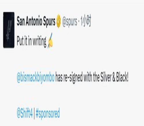 北京时间9月16日,马刺官方宣布,球队已经正式与比永博达成签约协议。Shams此前报道称,这是一份一年合同,而Scotto表示,比永博此次签下的合同为非保障性合同,这意味着在特定日期前,若球队选择裁掉他,无需全额支付薪资。