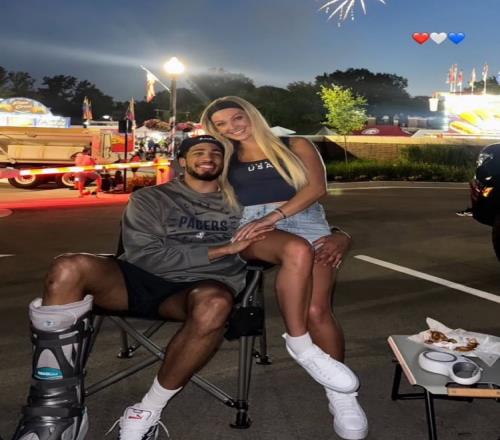 体育资讯7月5日报道宣称 当地时间7月4日是美国独立日,哈利伯顿和女友Jade在室外观看烟花秀庆祝节日。