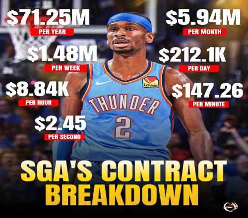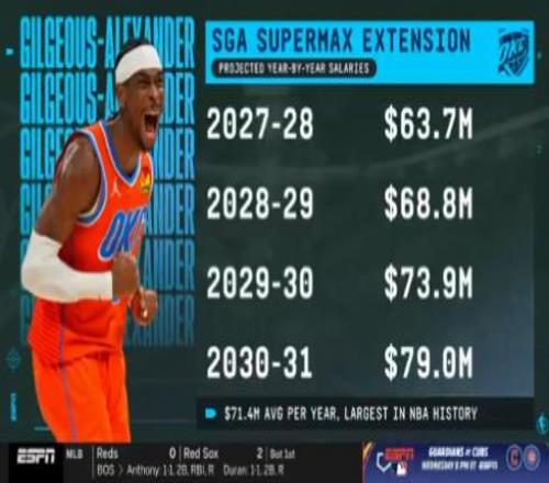 体育资讯07月05日报道宣称 此前据名记Shams报道,亚历山大与雷霆签下一份4年2.85亿的顶薪提前续约合同。