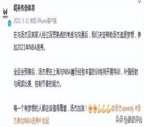 2021年夏天,该经纪公司社媒官宣写道:在与汤杰及其家人经过深思熟虑的考虑与沟通后,我们决定帮助汤杰追逐梦想,参加2021年NBA选秀。