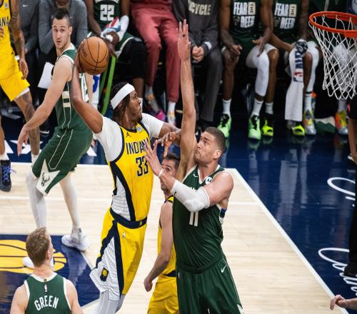 特纳的防守上限略逊于大洛佩斯,他最高仅位列年度最佳防守球员票选第五,而大洛佩斯在2022-23赛季高居第二。但在西亚卡姆加盟前,特纳常需独自承担步行者禁区守护者的角色,他从未与字母哥这般强悍的协防者搭档过。根据GeniusIQ网站对NBA高阶数据的追踪,本赛季对手在距离篮筐五英尺内面对脚步放缓的大洛佩斯时,命中率反而略高于面对特纳的表现。