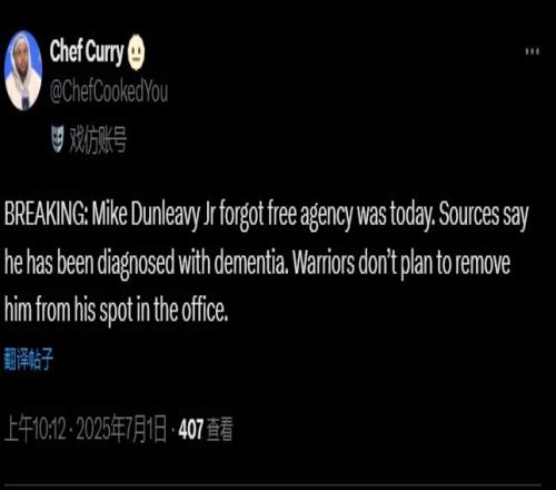 “突发新闻:小迈克-邓利维忘记了今天是自由球员市场。有消息称他被诊断患有痴呆症。勇士队不打算将他从球队经理的职位上撤下来。迈克-邓利维,你和拉科布正在毁掉库里的职业生涯。”Chef Curry又写了一条。