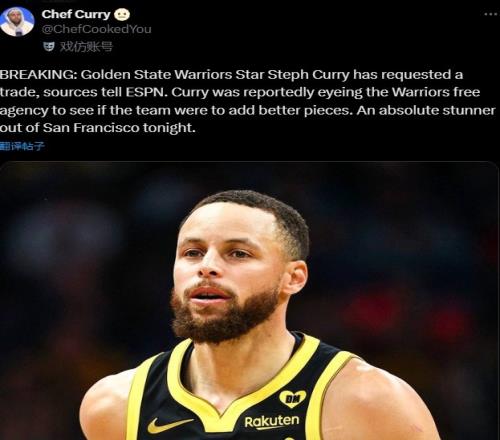 “突发新闻:据ESPN消息人士透露,金州勇士队球星斯蒂芬-库里已申请交易。据报道,库里正在关注勇士队自由球员市场,看看球队能否引进更优秀的球员。今晚旧金山湾区发生了一件绝对令人震惊的事。”Chef Curry杜撰写道。