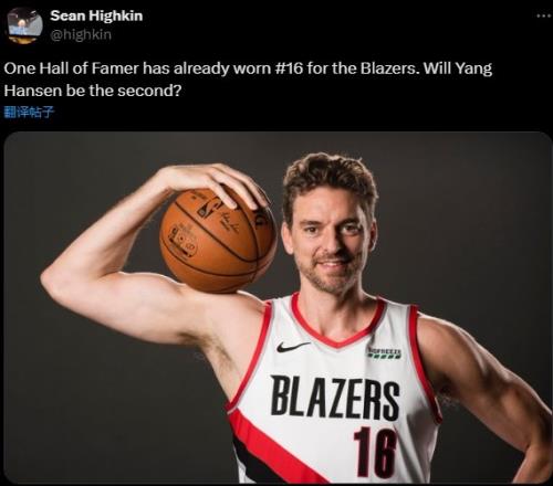 Sean Highkin写道:“曾穿开拓者16号球衣的大加进了名人堂,杨瀚森会是下一个吗?”