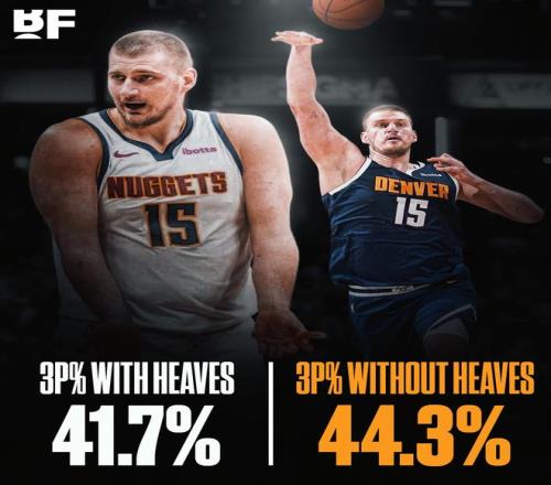 “尼古拉·约基奇是NBA新“半场进攻规则”的最大受益者之一,该规则规定,每节比赛末段的半场投篮不计入球员的命中率。上赛季,约基奇尝试了联盟最高的22次半场进攻,如果这项规则实施,他的三分球命中率将提升近3%。”