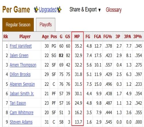 值得一提的是,上赛季杜兰特场均出场时间36.5分钟,高居联盟第7,而火箭队这边,上赛季仅仅范弗里特的出场时间超过了35分钟,场均有35.2分钟,其他球员没有一个人的场均出场时间超过33分钟。
