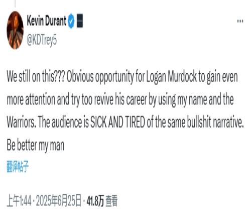 对此,凯文-杜兰特在个人社交媒体上回复了该记者的言论:“我们还在扯这个???Logan Murdock这不明摆着想蹭我名字和勇士的热度来博取关注和流量,从而试图挽救他那快完蛋的职业生涯吗?大家早就受够这套陈词滥调了。伙计,拿出点真本事吧!”