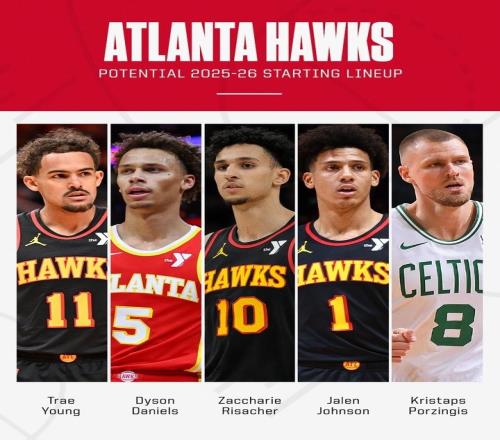 老鹰下赛季潜在首发:特雷-杨、丹尼尔斯、里萨谢、杰伦-约翰逊、波尔津吉斯。