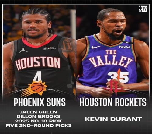 杜兰特被交易换来了杰伦-格林、狄龙-布鲁克斯和10号签?就这些?太阳从火箭得到的只有这些?我们肯定漏掉了什么对吧?他们应该还能拿回些自己未来的首轮签?没有?他们甚至没拉到第三方球队换回首发级别中锋?他们连复印机都没捞到——就像篮网当年交易科沃尔时那样(篮网当年在51顺位选中科沃尔后交易至76人,用换来的现金支付了夏季联赛的费用并买了一台复印机)?据我们所知,火箭连办公设备都没搭出去。