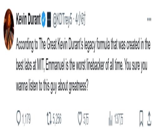 杜兰特现身Acho的评论区直接开喷:“根据伟大的凯文-杜兰特在麻省理工学院顶尖实验室打造的‘传奇公式’,Emmanuel Acho是史上最差的线卫。你确定要听这家伙讲什么是‘伟大’吗?”