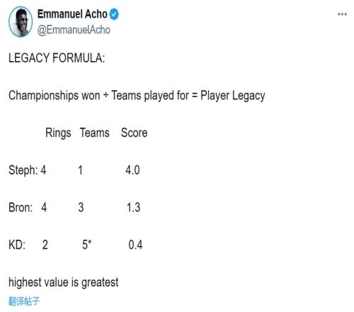 Emmanuel Acho还拿詹库杜举例子:“库里4/1=4分,詹姆斯4/3=1.3分,杜兰特2/5=0.4分。”