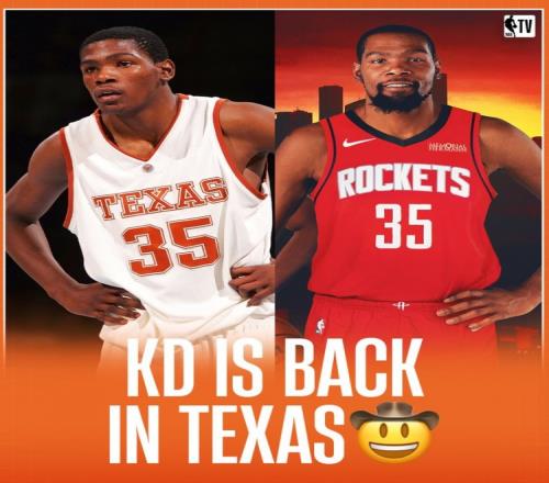值得一提的是,杜兰特大学生涯就读于德克萨斯大学(35号球衣被退役),他在时隔18年后再次回到了德克萨斯州。