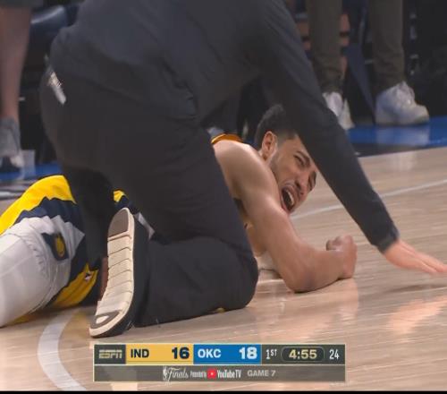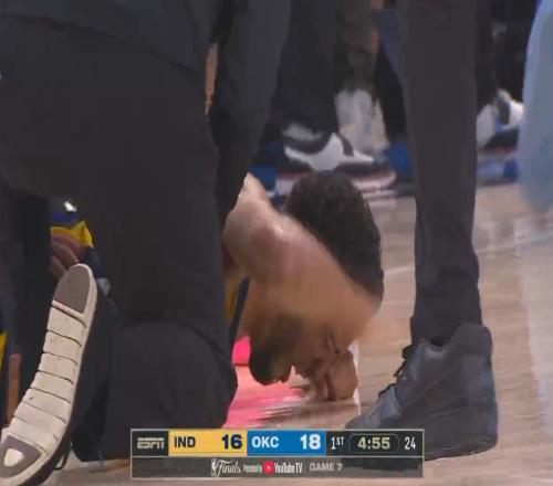 步行者当家球星哈利伯顿在首节一次突破时,蹬地启动受伤倒地。慢动作可以看到,哈利伯顿右小腿明显震动,他本人也非常痛苦,倒地后狂拍地板,几乎要哭出来了。