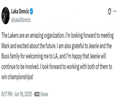 今天,湖人球星卢卡-东契奇更推欢迎新老板,他写道:“湖人是一个非常了不起的团体。我期待与马克-沃尔特见面,并对未来充满期待。同时,我也非常感谢珍妮和巴斯家族对我的欢迎。我很高兴珍妮将继续参与球队事务。我期待与他们合作,一起赢得总冠军!”