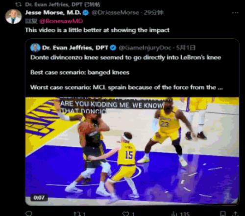 詹姆斯在今年季后赛首轮G5与迪文相撞致左膝内侧副韧带二级扭伤。