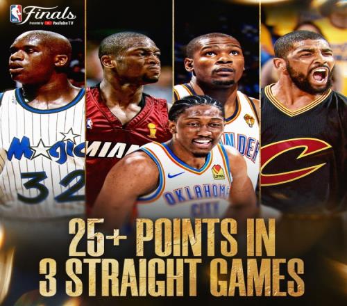 他已经连续三场总决赛得分超过25分,这也让他成为了NBA近40年来第5位连续3场总决赛得分达到25+的25岁以下球员,另外四人分别是1995年的奥尼尔、2006年的韦德、2012年的杜兰特还有2016年的欧文。