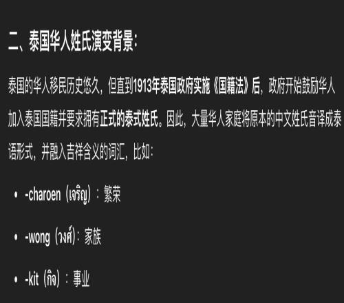 今天遇到一个很有意思的姓氏,Tungkitkancharoen,一个泰国复姓。其中 “kancharoen” 在泰语中意为“繁荣”或“昌盛”,而 “Tungkit” 的来源则颇为神秘,可能是中文姓氏的音译,比如“邓”或“董”,也可能源于泰语本身,或是两种语言在历史交汇中的自然融合。