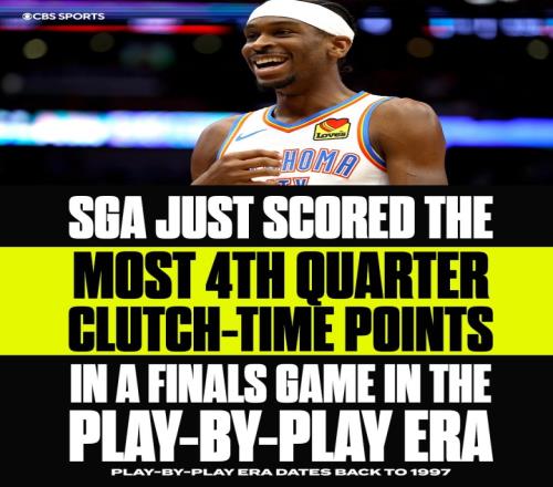 体育资讯06月14日报道宣称 NBA总决G4,雷霆111-104击败步行者,大比分2-2打平,亚历山大关键时刻(比赛时间还剩5分钟以及加时,双方分差在5分之内的时间段)砍下15分。
