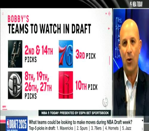 名记:高管说会看到很多首轮签交易马刺&76人&篮网&火箭值得关注