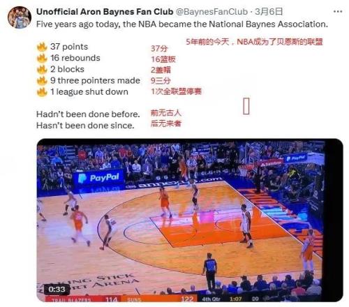 你可能想不到,在大洋彼岸,有一位阿隆-贝恩斯球迷,他运营的账号名为“非官方阿隆-贝恩斯球迷俱乐部”,拥有包括TA官方以及贝恩斯效力过的多支球队的跟队记者在内的5.4万粉丝。时至今日,虽然贝恩斯早已退役,但这位运营者依然活跃在社交媒体上,时不时地拿出贝恩斯的那场生涯代表作,向人们展示他的伟大——