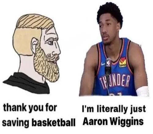 社交媒体就这么神奇地把这个梗传播起来了,人们创作出了更多版本的“阿龙-维金斯拯救了篮球”。然后,球迷群体、媒体、维金斯本人和他的队友们,也全都知道了。