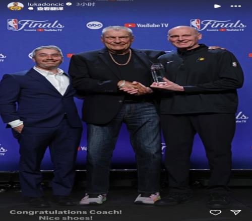 老尼尔森在今天的总决赛之前领取了奖杯,东契奇转发评论道:“恭喜教练,鞋不错啊。”