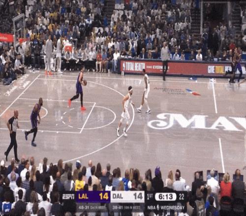 洛杉矶湖人队拥有身高七英尺(约2.13米)的中锋贾克森-海斯,他在常规赛中理论上扮演了这一进攻角色。请看下面的画面:东契奇召唤海斯上前设置掩护,然后找到他完成空中接力。