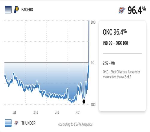雷霆最后3分钟领先9分,胜率96.4%(最终输球)。”