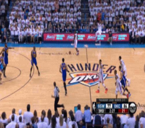 G3移师至雷霆的主场进行,杜兰特全场砍下33分,威少砍下30分12助攻,亚当斯全场抢到8个前场篮板,帮助雷霆制霸内线;库里此役因犯规困扰,全场仅出战30分钟;最终雷霆在主场133-105屠杀了勇士,总比分2-1领先对手。