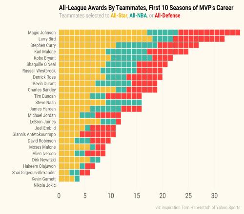 以下为部分MVP球员职业生涯前10个赛季中队友入选联盟最佳奖项统计: