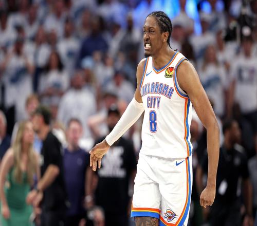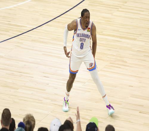 杰伦威熬过来了,常规赛他场均轰下21.6分外加5.3个篮板、5.1次助攻、1.6次抢断和0.7次封盖。攻防兼备。作为亚历山大身边的副攻手,当亚历山大被严防,杰伦威接管比赛的能力明显提升,7次单场轰下30+高分。