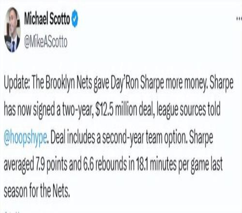 早在自由球员市场正式开启前,就有报道称夏普将与篮网队达成一份价值1200万美元的合同。篮网队此前一直暂缓完成这份签约,同时也未敲定与扎伊尔-威廉姆斯的类似1200万美元合同,其目的是为了保留薪资空间的灵活性,以便后续操作。Scotto报道,最终夏普签下的是2年1250万美元,第二年是球队选项。
