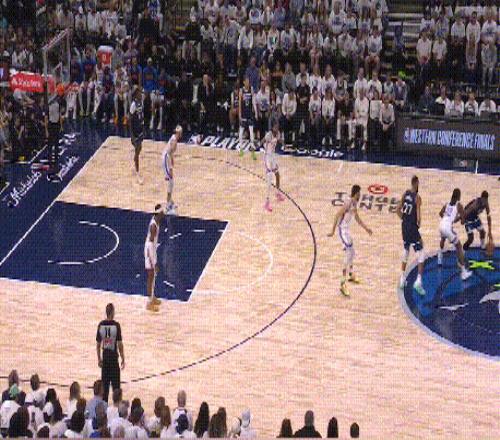 而让兰德尔冲进来,充分吸引兵力到篮下,进而给底角射手大空位,这应该是防守失误。雷霆需要在兰德尔上线启动的时候就让他降速,逼迫兰德尔在罚球线附近犹豫,这才是他们之前防兰德尔的正确姿势。他们今天开场给兰德尔的防守强度不够。