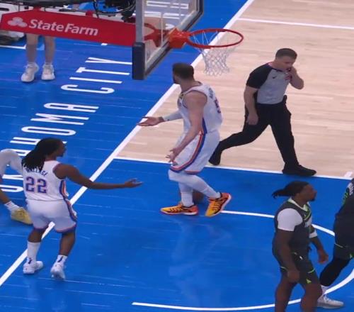 西决G1开场不到四分钟,森林狼已累计四次全队犯规。罪魁祸首是?亚历山大一次慵懒的左路突破:他在禁区突然缩小转身半径的同时完全刹停,在拥挤的禁区迫使杰登-麦克丹尼尔斯发生身体接触。哨响!亚历山大摔倒在地,他将双手枕在脑后,或许是两天前抢七大战后的疲惫展示,亦或是宣告这是自己领地的从容姿态,欢迎来到我的地盘。无论这是何种意味,爱德华兹显然不吃这套。当亚历山大躺在地板上时,爱德华兹漫不经心地把球砸向他的膝盖方向。技术犯规!亚历山大再获一次罚球,他甚至无需为此付出任何努力。