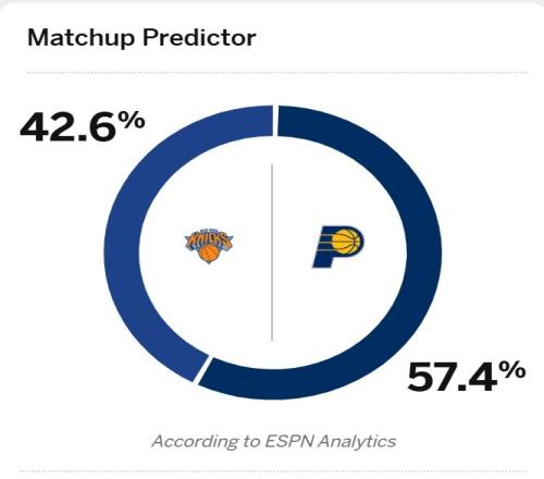 赛后ESPN对系列赛G3进行了胜率预测,步行者胜率为57.4%,尼克斯则是42.6%。