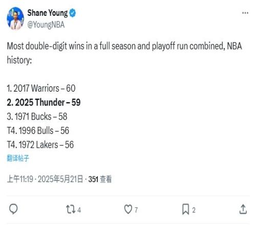 据记者Shane Young统计,这是雷霆本赛季第59次净胜对手两位数分差,排名历史第二,历史第一的是2017年勇士的60次。